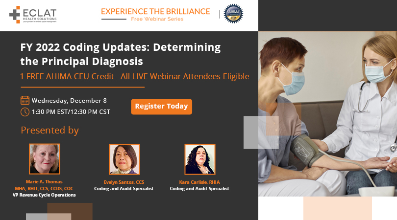 Join ECLAT’s AHIMA-Approved WebinarFY 2022 Coding Updates and Determining the Principal Diagnosis Wednesday, December 8th, 1:30 pm EST/12:30 pm CST |